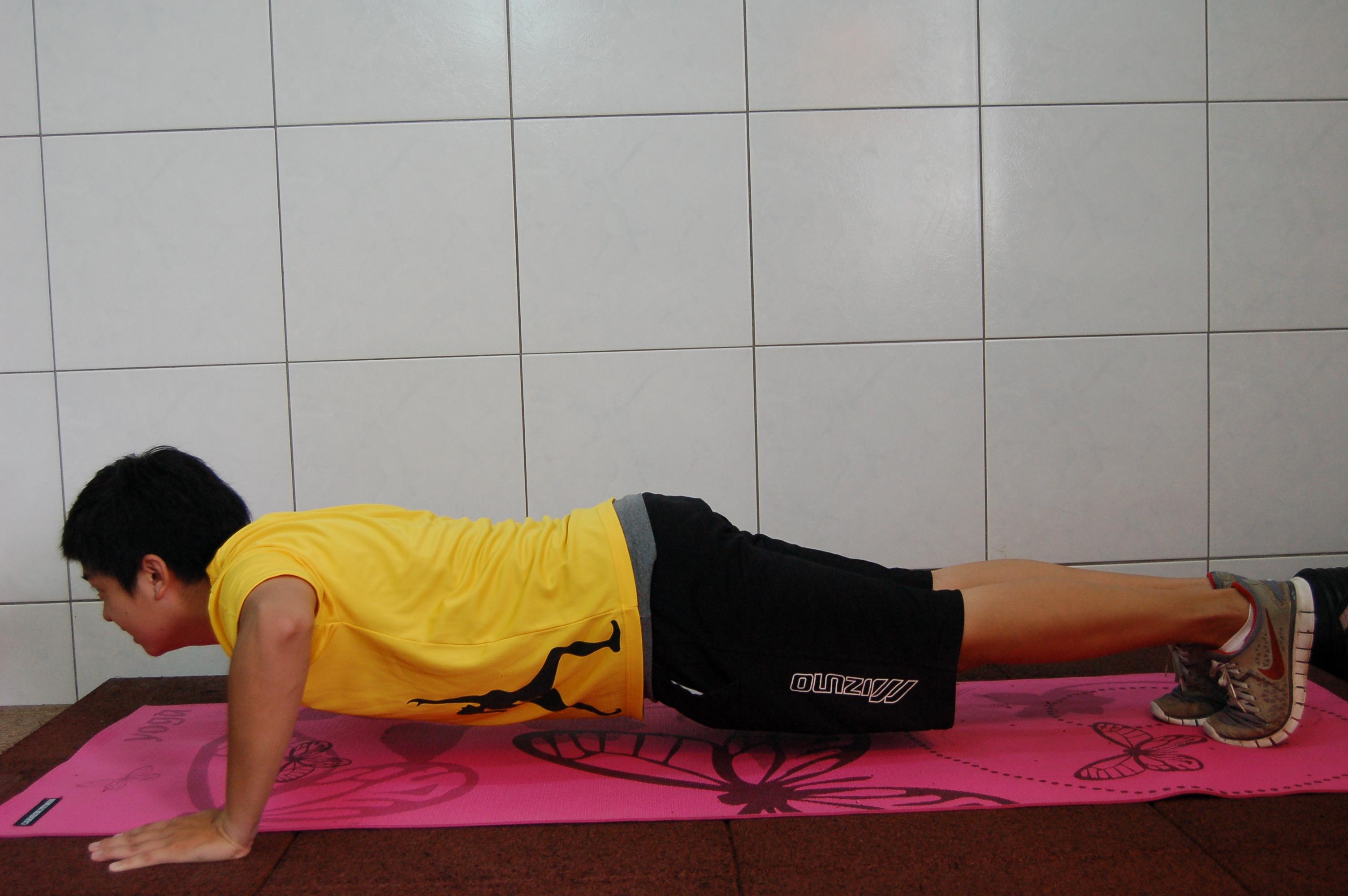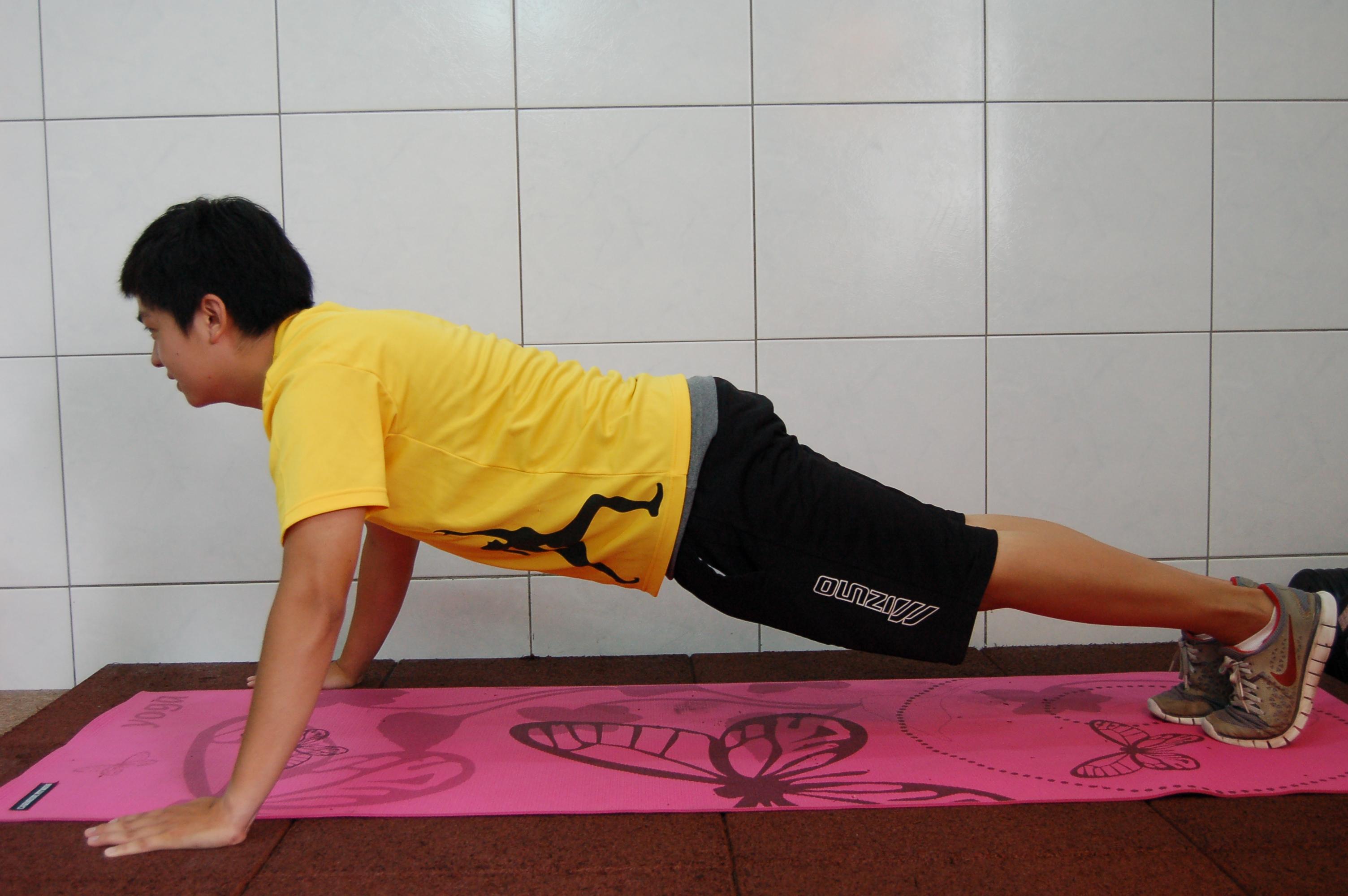 1. 手掌與腳尖支撐於地板,腹肌保持適當張力,維持下背良好曲線。
