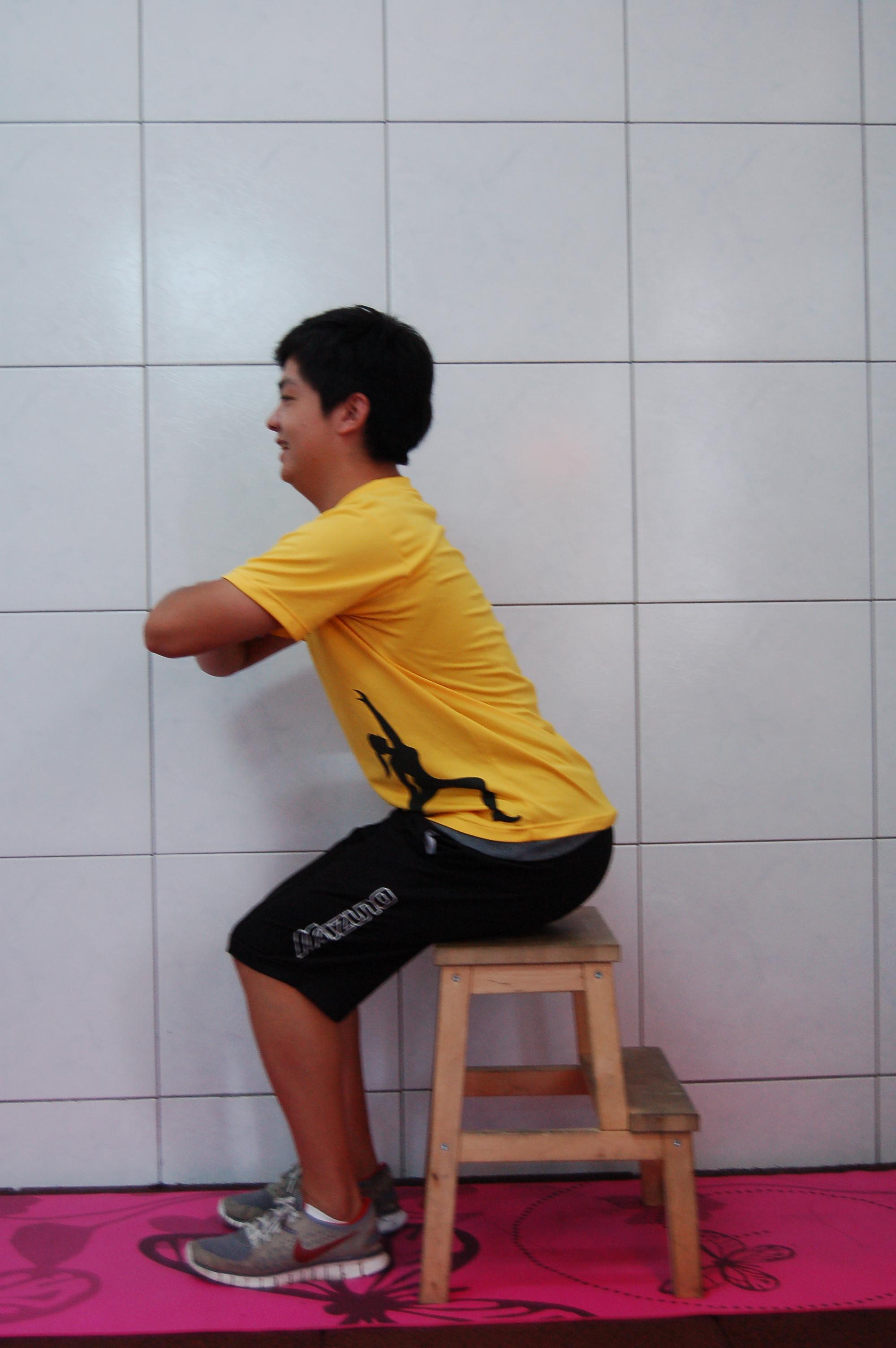3. 屈膝、屈髖以慢速下蹲身體,直到臀部略為接觸椅子。