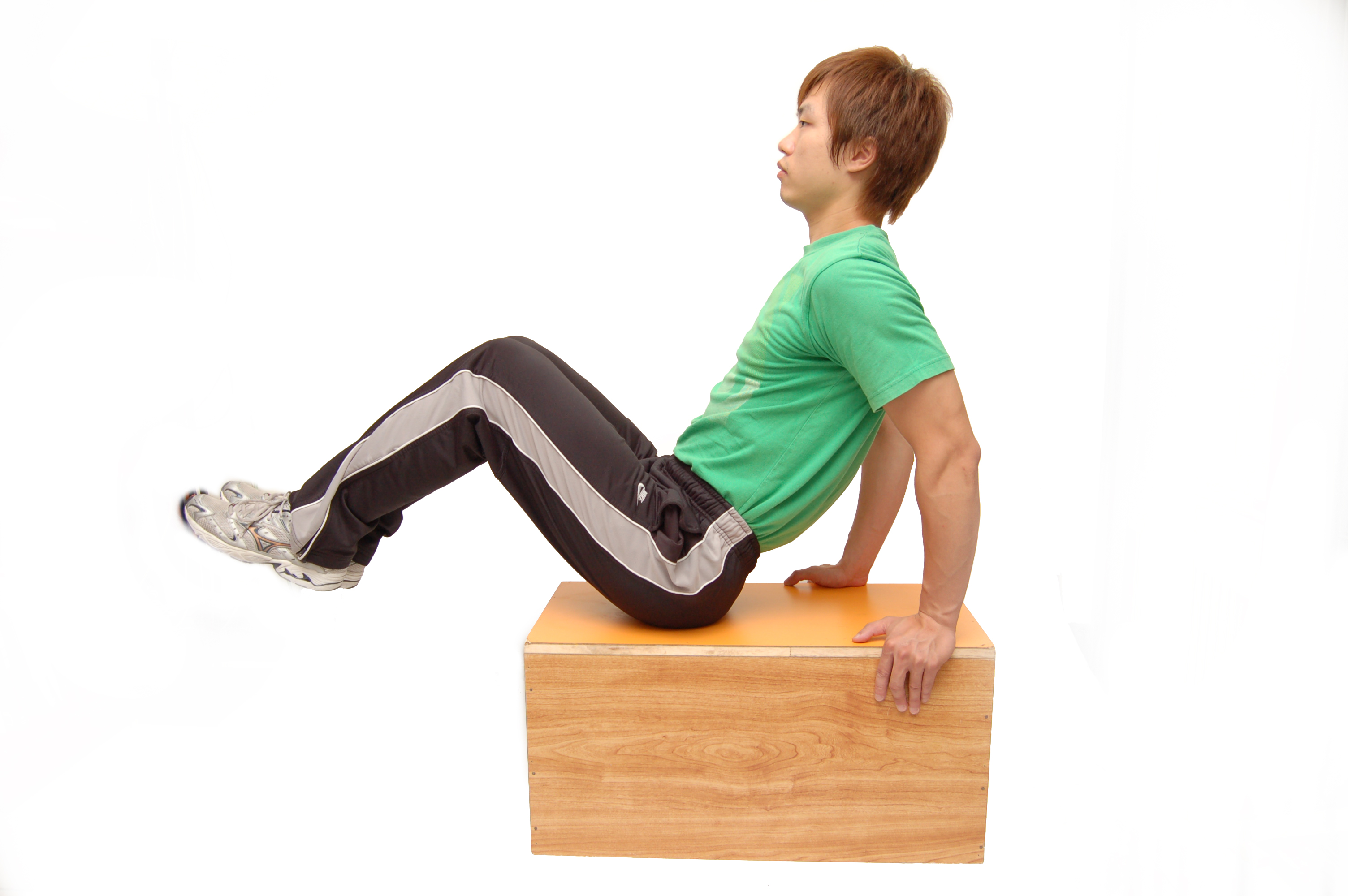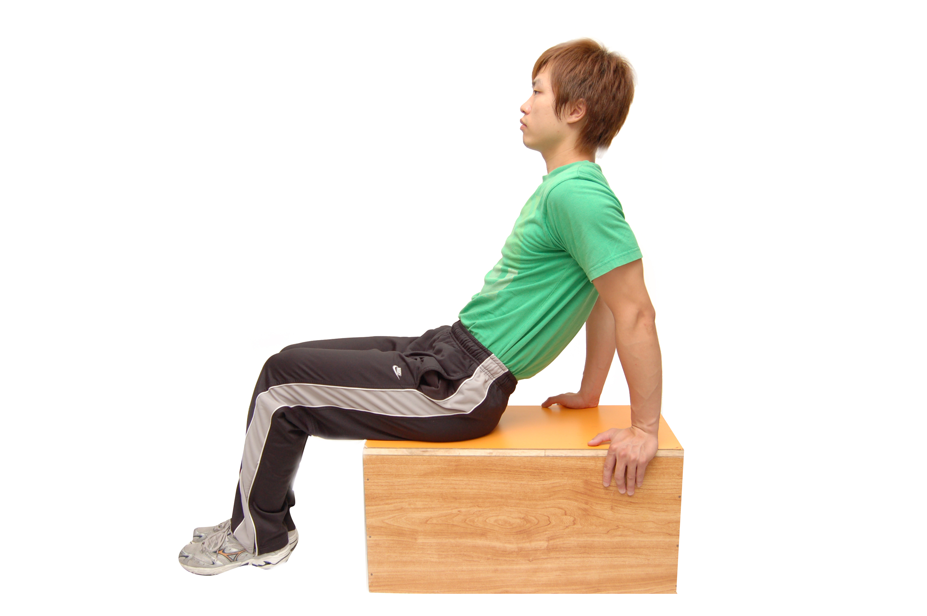 1. 坐在椅子或箱子前端,雙手抓握椅子或箱子側邊。